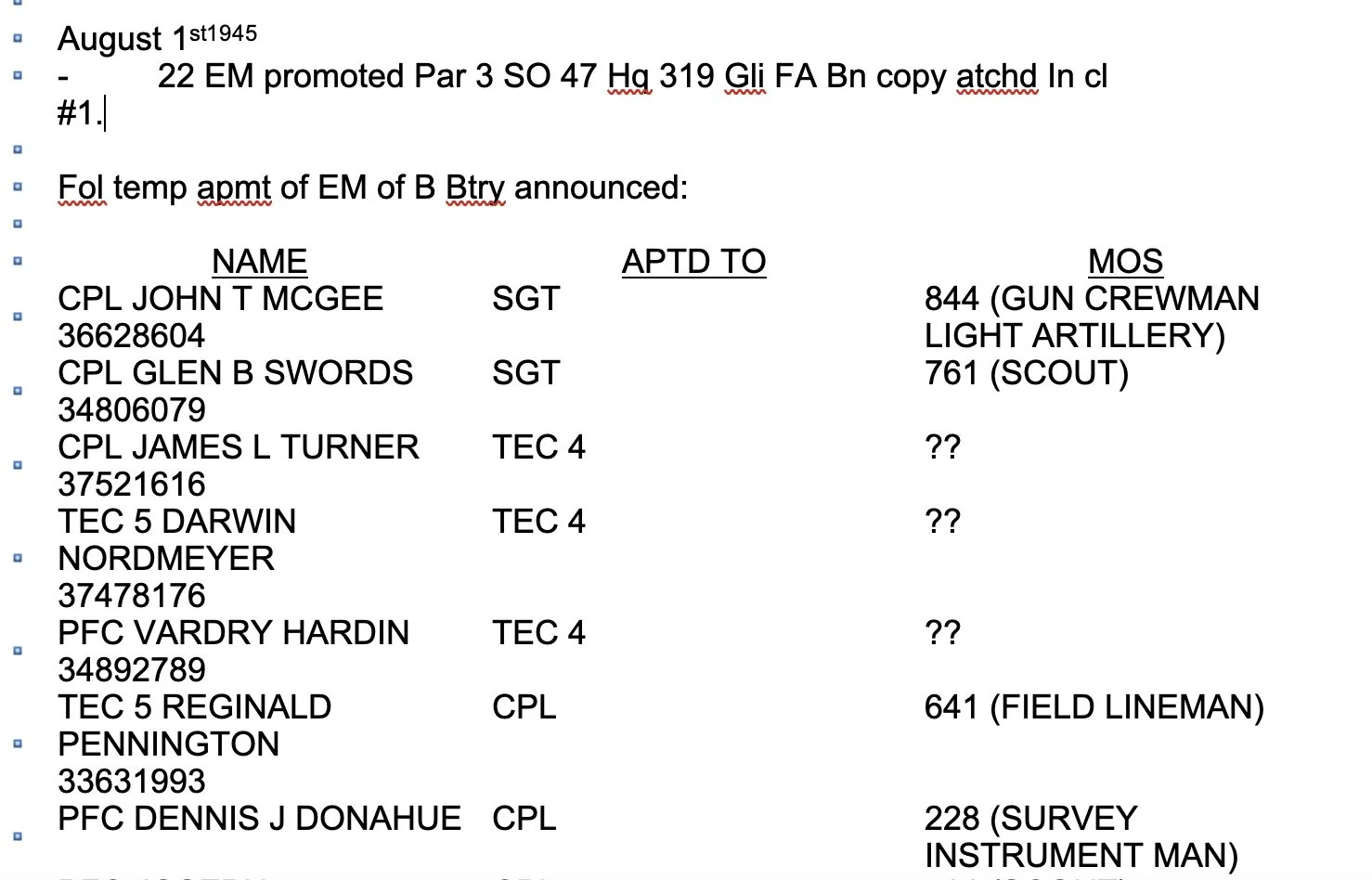November 29th, 1945; Cpl Dennis J Donahue 36833992 MOS 228 (Survey Instrument Man), fr Dy to Trfd in grade to 536 Eng Lt Pontoon Co. Camp Washington per par 21, SO 254 Hq 82nd Abn Div.