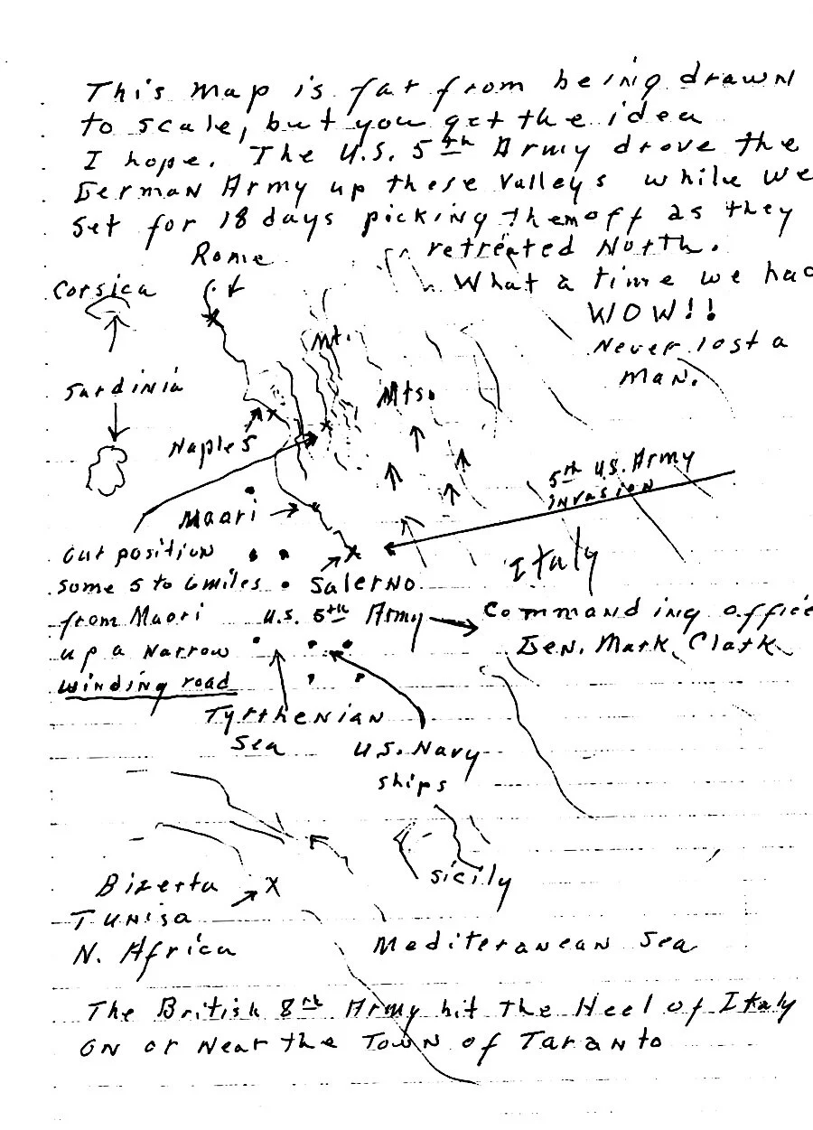 Elden Smith’s hand drawn map - illustration of the battle lines on the west coast of Italy (Maiori - Naples) and North Africa