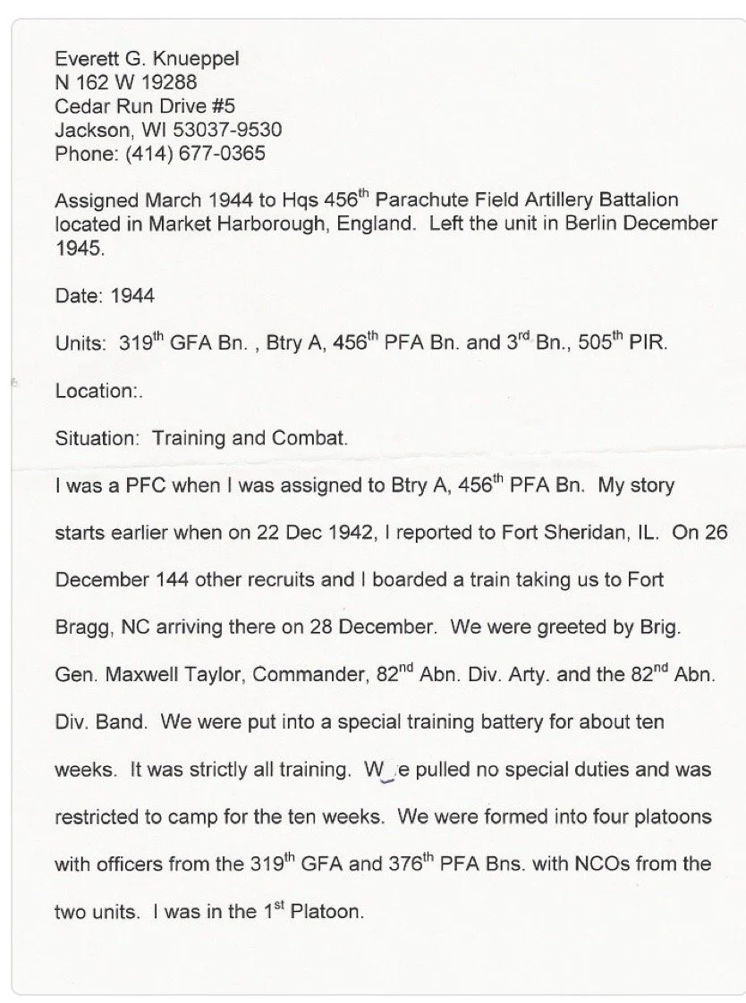 I am Everett Knueppel. I am a charter member of the Badger Chapter, 82nd. AIRBORNE Division Assn., also a charter member of the 82nd. (same, joined in 1945 on discharge..strictly an 82nd. man) I received my draft notice Nov. 4. to report Dec. 14th to take a physical exam for induction. On Dec. 22nd I was to report to Ft. Sheridan, Illinois.