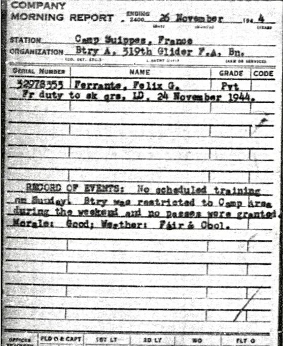 Company Morning Reports were produced every morning by the individual Army units to record personnel matters. The following events (see below) were reported for Felix Ferrante: