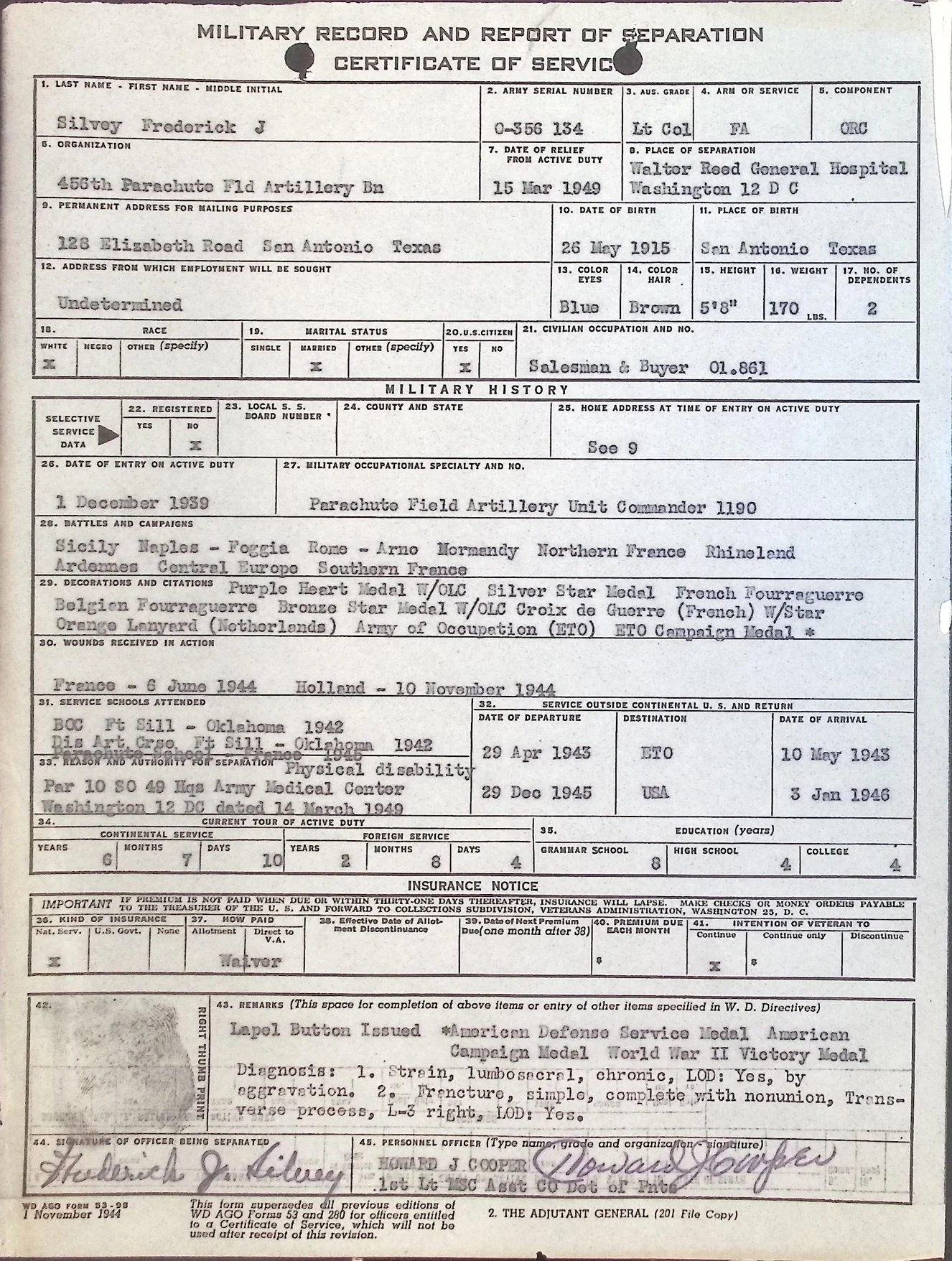 “For gallantry in action on 11 June, 1944, near (censored) France, when his battalion was supporting an infantry counter attack. Major Silvey moved forward with the riflemen as assurance that the close in artillery fire was friendly and under control. When radio communication failed, he formed a voice team to his battalion through the infantry command posts. He moved about thorough intense small arms, mortar and artillery fire, with complete disregard for his own safety. This example was instrumental in maintaining the momentum of the attack. Major Silvey’s aggressiveness, courage and calm devotion to duty in the face of danger are in keeping with the highest traditions of the airborne forces. Entered military service from San Antonio, Texas.”