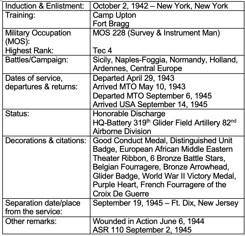 Decorations and citations: European African Middle Eastern Service Medal w/ 6 Bronze Service Stars, Good Conduct Medal, Unit Citation Badge, 2 Bronze Service Star Normandy and Holland, Bronze Service Star Germany, Distinguished Unit Badge, Purple Heart, Bronze Service Arrowhead.