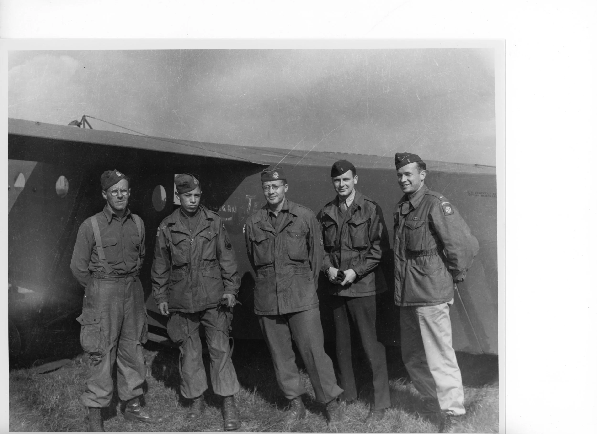 Kneeling (L-R) Manuel Tavares, Roland “Chinks” Combs, standing (L-R) Hall (pilot), Benton Lytton, Charley Hester - photo taken at the Cottesmore Airport, England, minutes before the glider mission into Holland - September 18, 1944