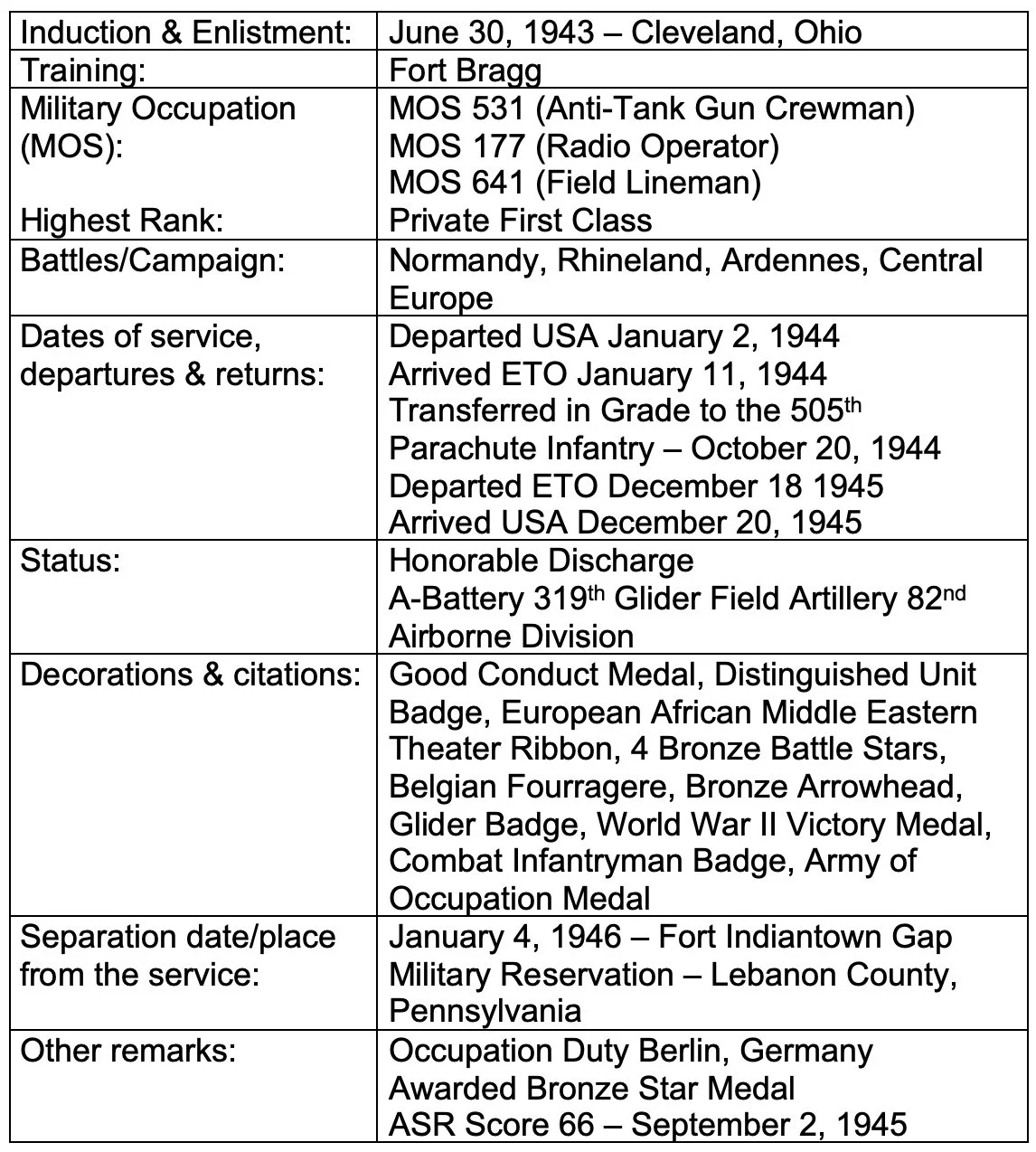 I was amazed by everything here it was a different world. I remember being in New York in a car, the traffic pattern amazed me the car stops the car goes the big buildings the lights it was amazing. Well, we drove form there to Cleveland Ohio, then it took 2 days there were no freeways back then. When I arrived I went to school in Shaker heights Ohio, I could barley even speak the language. In 1943, I volunteered for the U.S. Army even though I was not a citizen. I was in the 82nd airborne division in Fort Bragg, North Carolina. Then, they shipped us to Africa and from there to Italy and from there we went to England. And in England we were being trained for the invasion of Normandy.
