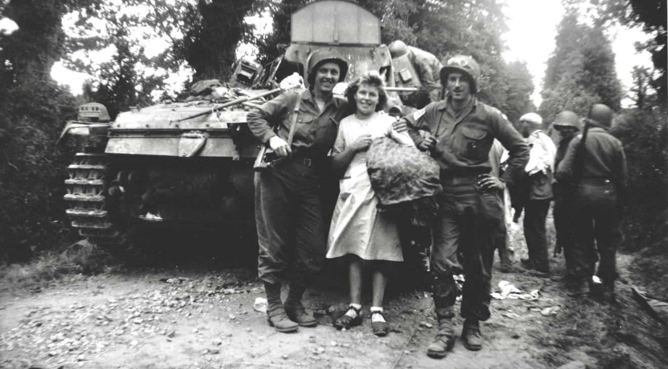 Myron Lepkowski (L) and Milton Susman pose near Ste. Mere Eglise with French woman - Normandy - D+